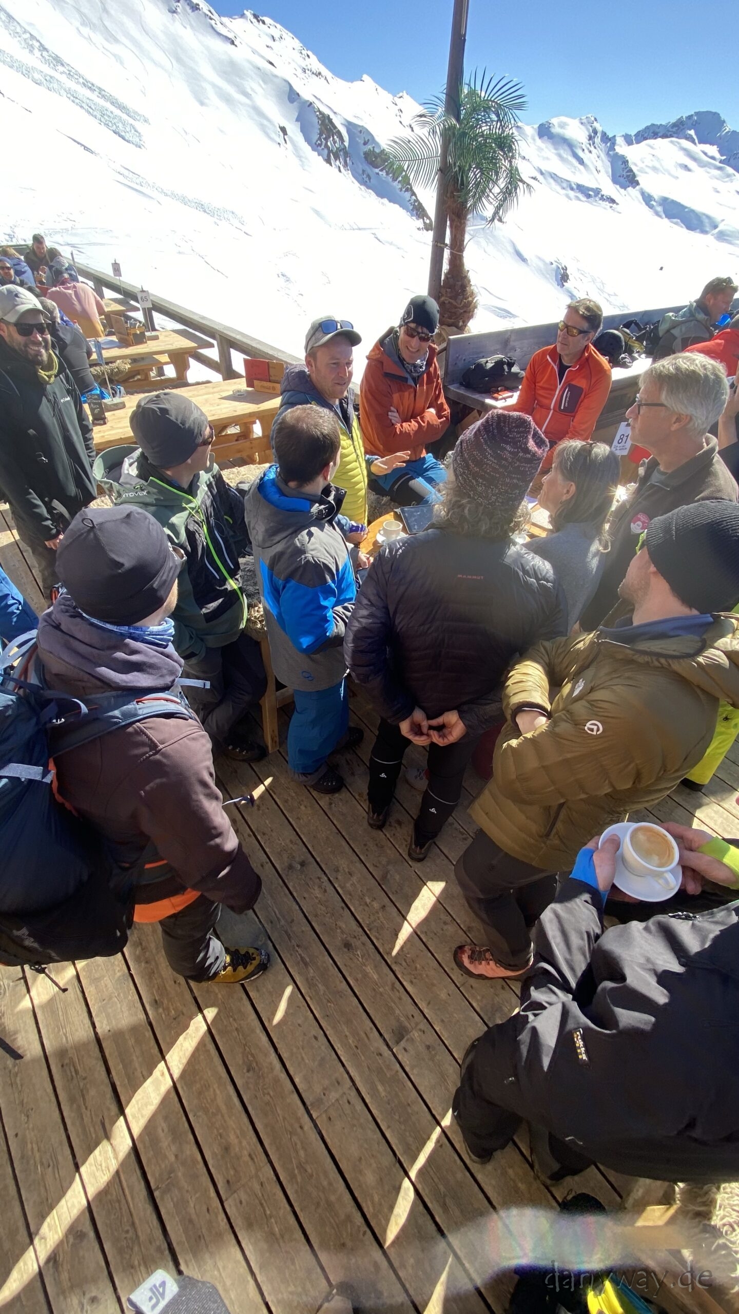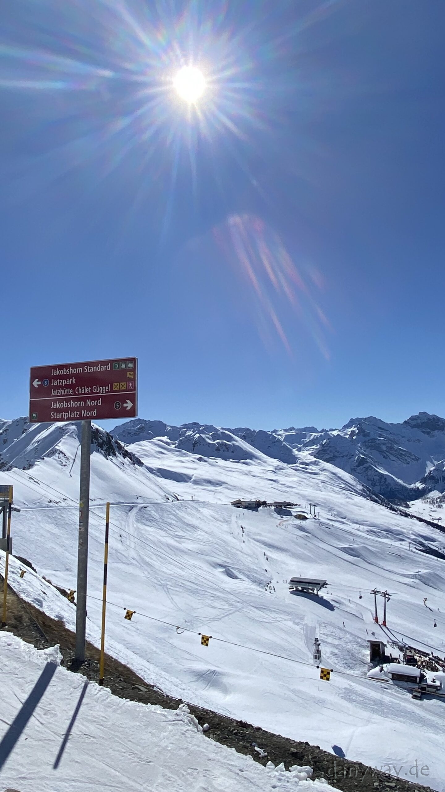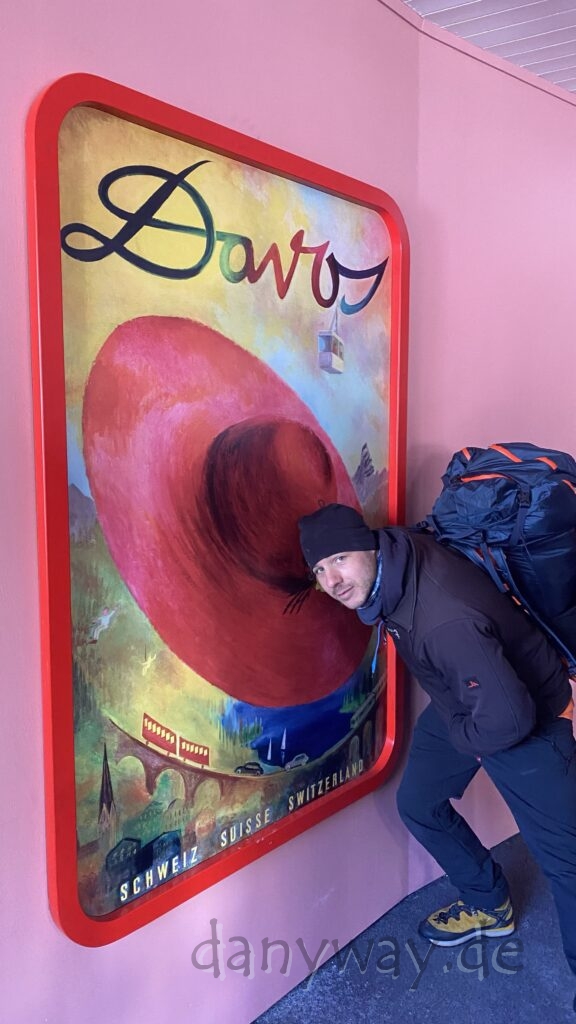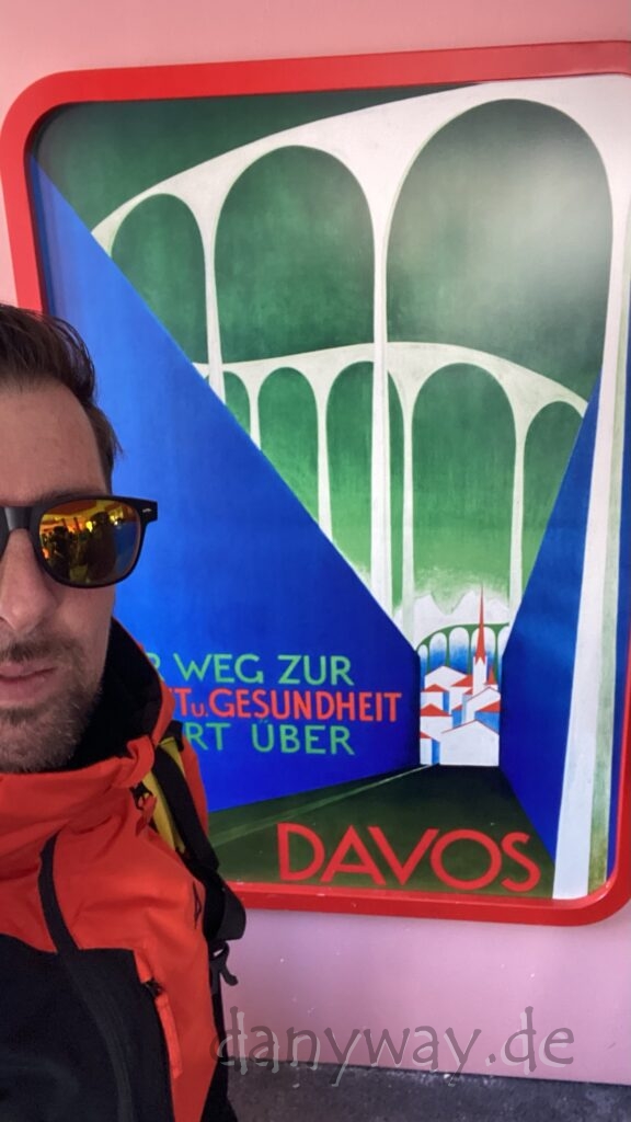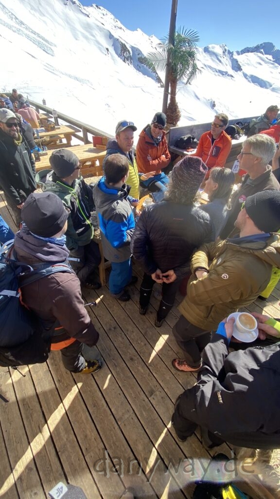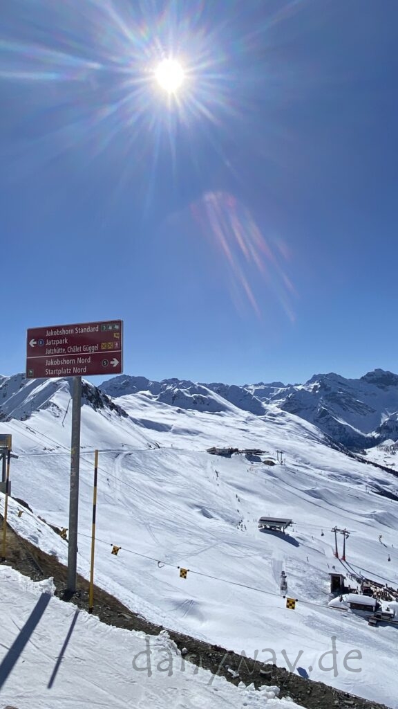 Die Strecke zieht sich doch ganz schön und wir sind etwas später dran. Anschluss an die Gruppe finden wir bei der Jatzhütte. Die Bahnfahrt aufs Jakobshorn verlief zügig und oben angekommen, blauer Himmel und Sonnenschein, mit einem überwätigendem Panorama.
