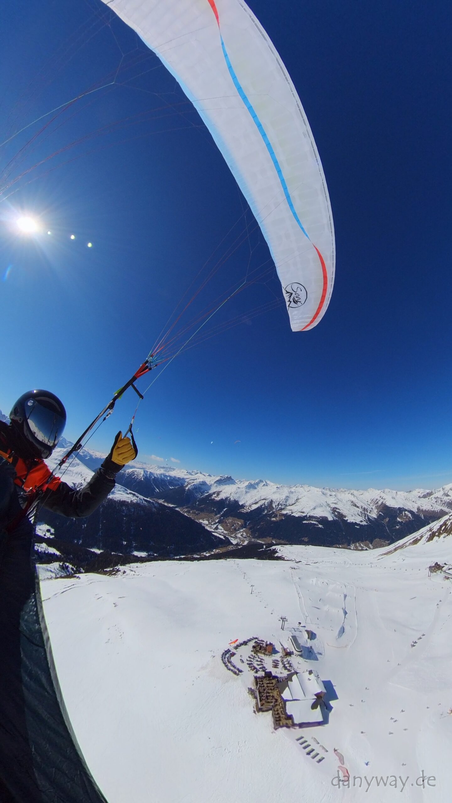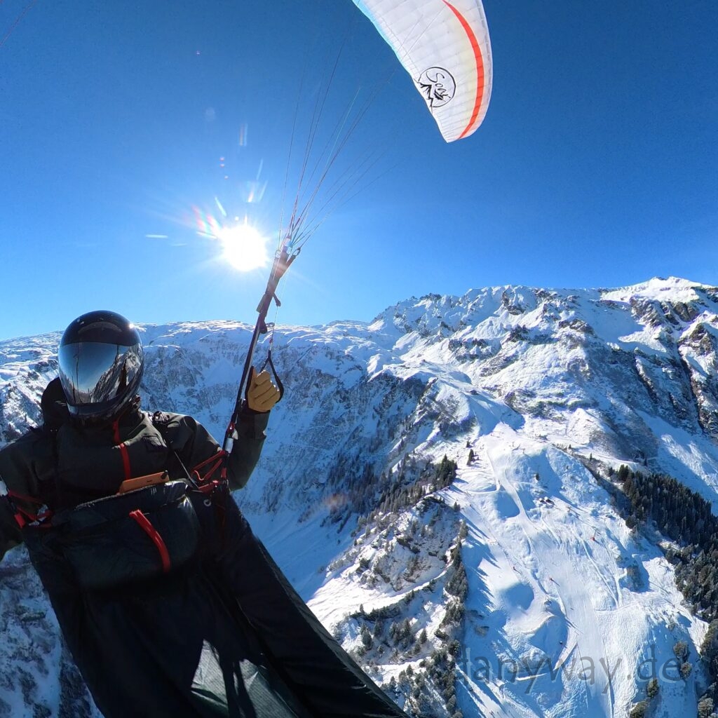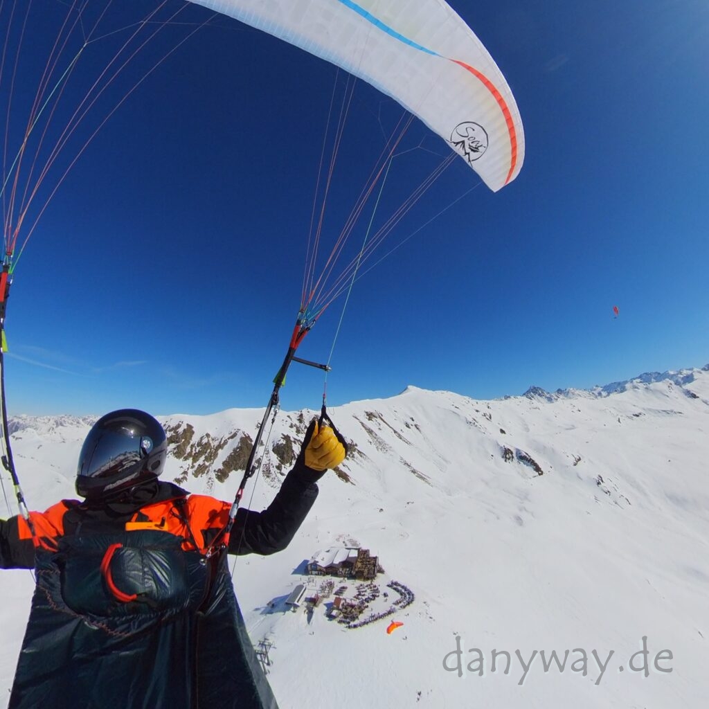 Das Briefing durch Jonas deckt alles ab und die Gruppe macht sich zügig an die Startvorbeitung. Talwind beachten! Gestartet wird direkt bei den auf den Sonnenliegen chillenden Touris, mit Technobeats im Hintergrund und DJ. Hat man auch nicht alle Tage:) Windrichtung S-SW wechselnd, leicht und seicht, Rückwärtsstart klappt super und das Einfädeln ins Liegegurtzeug sitzt:) Es sind bereits Schirme in der Thermik und werden direkt verfolgt. 12:45h, es geht ab, wow und wird immer besser!