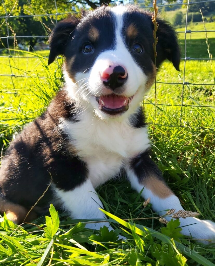 elChapo – ein Bordercollie aus einem Wurf von 11 Welpen auf einem Bauernhof im Rheintal, Altstätten. Ben der gestandene Vater, Sia die jüngere Mutter.