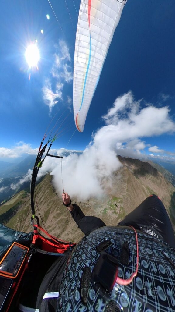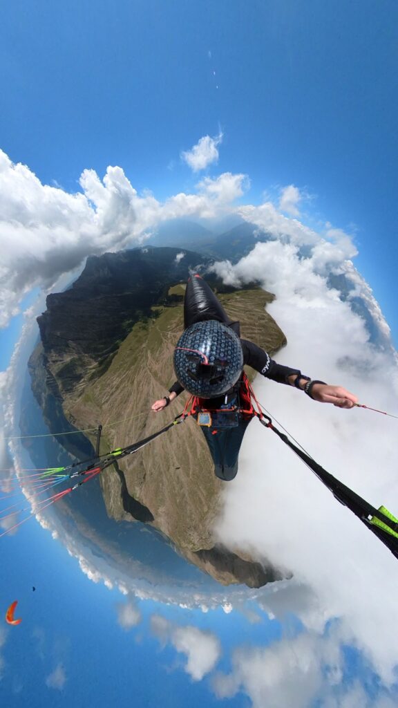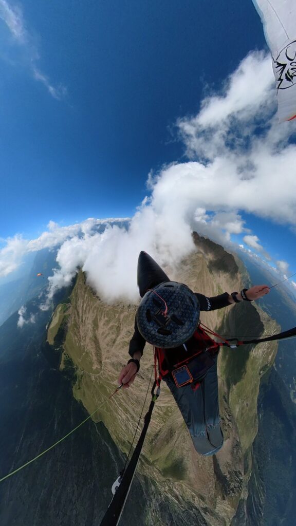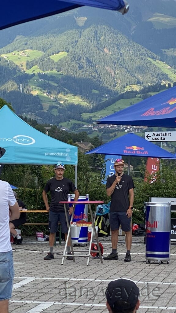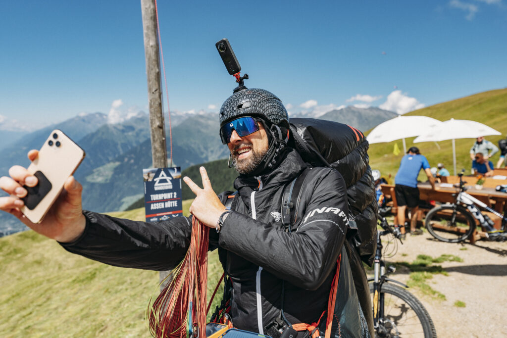 Die Sachen waren schnell gepackt, die Nacht kurz, noch schnell etwas frühstücken und ab die Post. 30 Minuten fahrt und wir sind beim Start. Es findet nochmals ein Briefing statt, die Atmosphäre ist gut, alle super gut gelaunt und motiviert. Der Countdown läuft! 3-2-1 —gogogo. Ich habs chillig angehen lassen und das Feld hinten abgeschlossen, während die Profis bereits nach 30 Minuten am ersten Startplatz ,Muthöfe, angekommen sind, dauerte es bei mir gut 60 Minuten für die knapp 600 Höhenmeter. Ein guter Einstieg für mich und das Rennfieber hat mich gepackt, ich tauche voll in die Stimmung ein. Ein Selfie beim Turnpoint, ein Redbull und ab an den Startplatz.